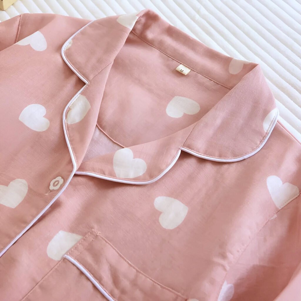 Fall asleep in pure comfort with the Luna Hearts Pyjamas. Made from soft, breathable cotton, this set feels light and soothing against the skin. The delicate blush heart print adds a playful yet romantic touch — perfect for nights of cozy relaxation or lazy mornings in bed.